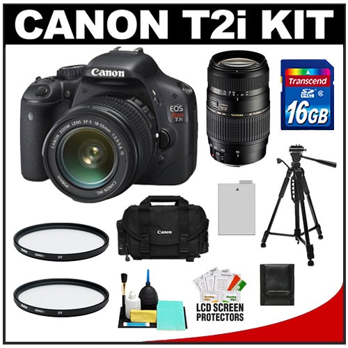 | Canon EOS Rebel T2i Digital SLR Camera Body & EF-S 18-55mm IS Lens (Black) with Tamron 70-300mm Lens + 16GB Card + Battery + Canon 2400 DSLR Gadget Bag Case + Tripod + Filters + Accessory Kit |